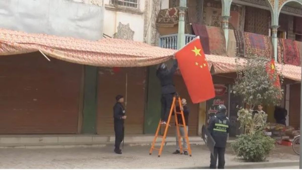 الكاميرات ونقاط التفتيش التابعة للشرطة منتشرة في كل مكان تتدلى الأعلام الصينية من كل كشك في السوق وواجهة متجر في أحد مقاطع الفيديو، تتوقف مجموعة من ضباط الشرطة للتحقق من أن الأعلام معلقة.
