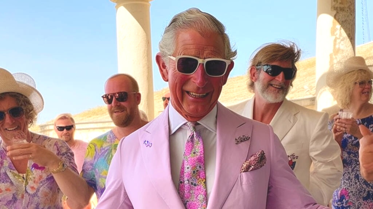 يتداول مستخدمون لمواقع التواصل الاجتماعي صورًا ادّعى ناشروها أنّها تُظهِر الملك تشارلز محتفلاً على شاطئ وهو يرتدي ملابس بألوان زاهية.