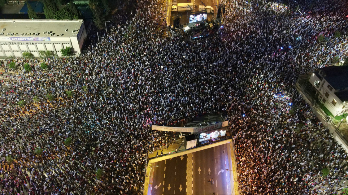 في تل أبيب، المركز التجاري للبلاد، احتشد عشرات الآلاف مرددين شعارات مؤيدة للديموقراطية وقرعوا الطبول في التجمع الأسبوعي التاسع والعشرين على التوالي.