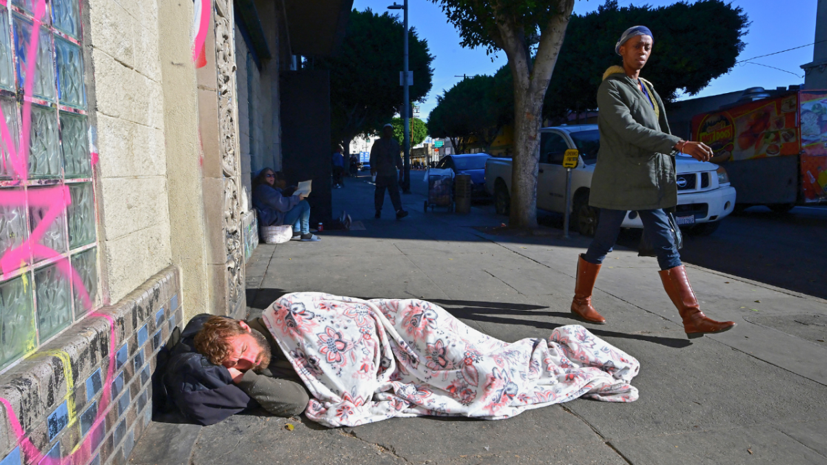 مشاة يسيرون بجوار رجل بلا مأوى ينام على الرصيف في 22 نوفمبر 2023 في لوس أنجلوس. أ ف ب