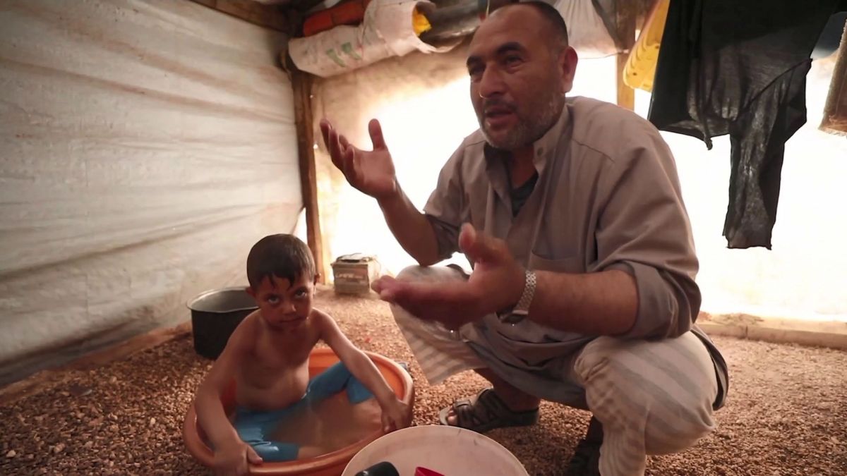 النازحون السوريون يعانون حرارة الصيف … محمود الأحمد ، نازح سوري في مخيم تل الأمين في ريف إدلب في سوريا، يجد نفسه مضطرا لتحميم أطفاله كل ربع ساعة كي يساعدهم على تحمل حرارة الصيف اللاهبة.