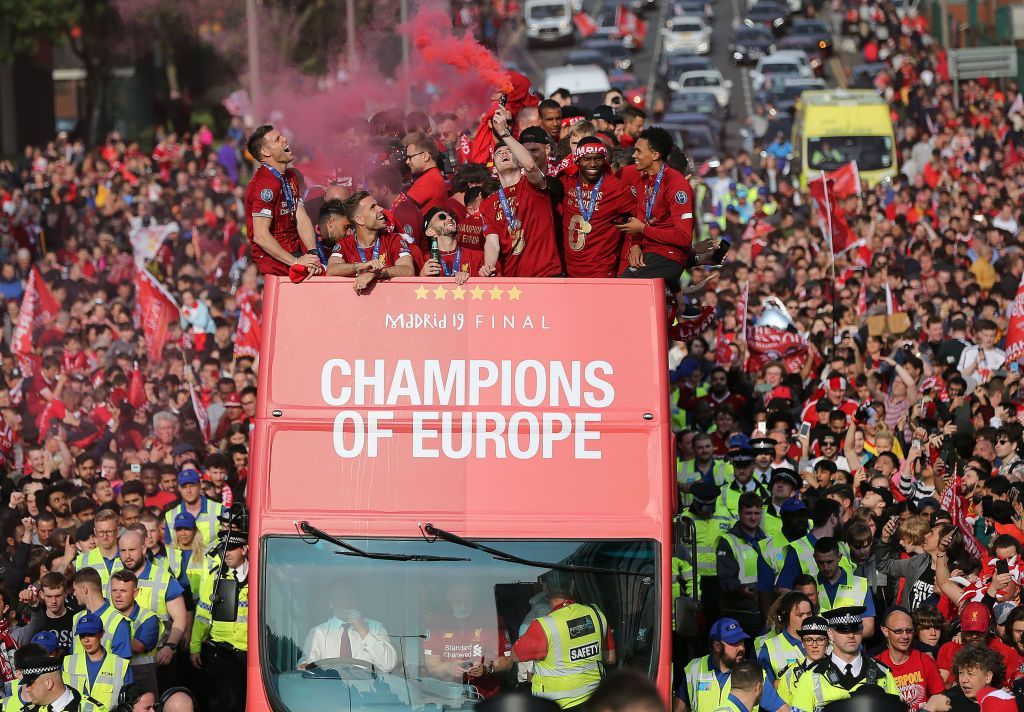 وتبادل اللاعبون كأس دوري الأبطال من على فوق الحافلة، ولوحوا بها للجماهير العارمة التي احتشدت لتحية فريقهم الذي أصبح بطل أوروبا مساء السبت