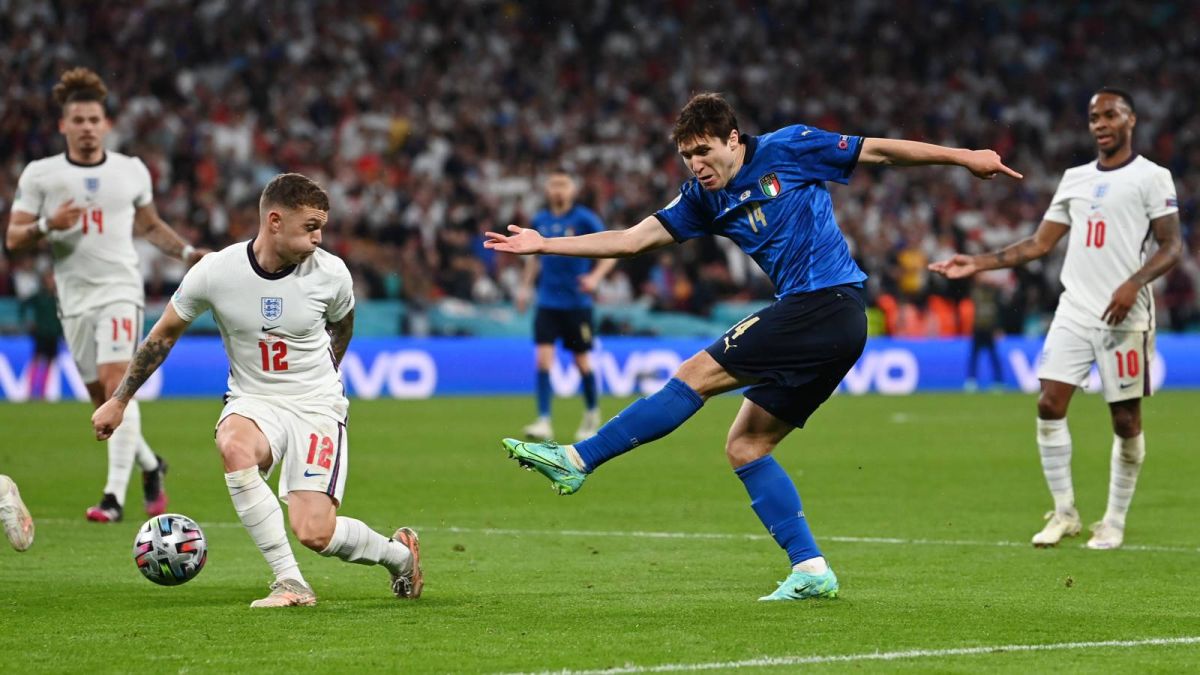 🇮🇹 كييزا من مجهود فردي يسدد ويهدد المرمى الإنكليزي، كرته كانت على بعد سنتيمترات قليلة جداً من مرمى إنكلترا. 😮#يورو2020 | #إيطاليا_إنجلترا pic.twitter.com/If9ijagb8e