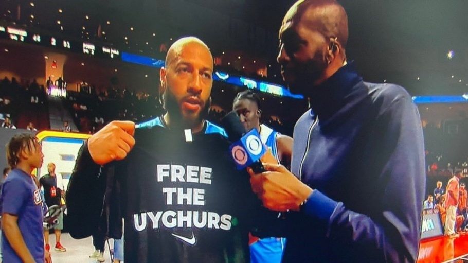 - رويس وايت يظهر في مقابلة تلفزيونية بعد مبارة لكرة السلة وهو يحمل قميصاً عليه شعار “حرروا الإيغور”