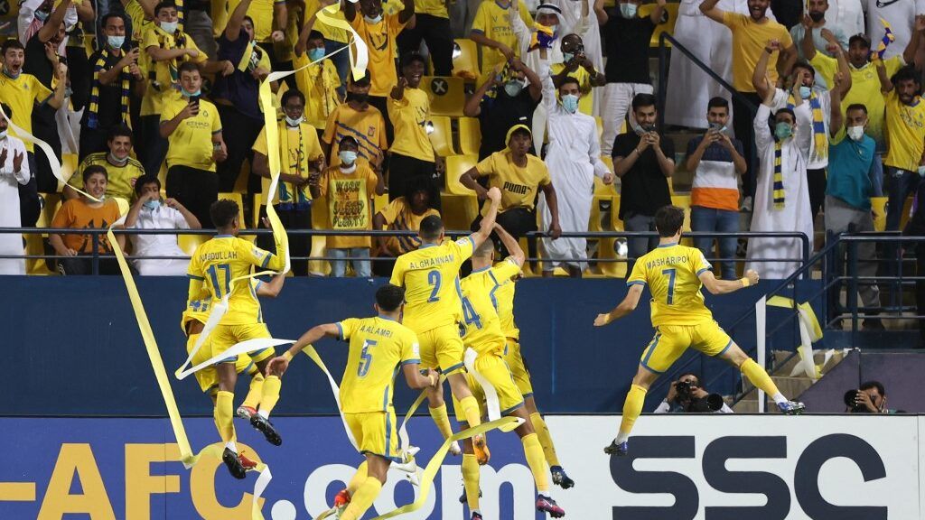لاعبو النصر يحتفلون أمام الوحدة في ربع النهائي. المصدر: AFP