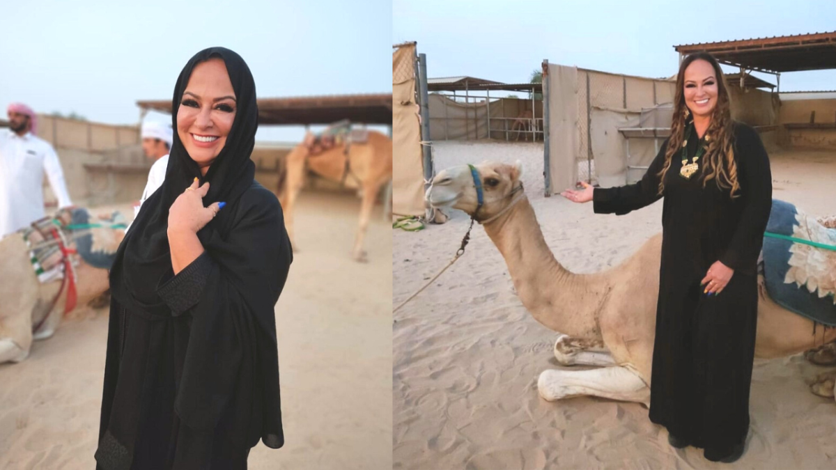 وتظهر في الصورة سيّدة ترتدي نقابًا وعباءة سوداء وتركب جملاً.