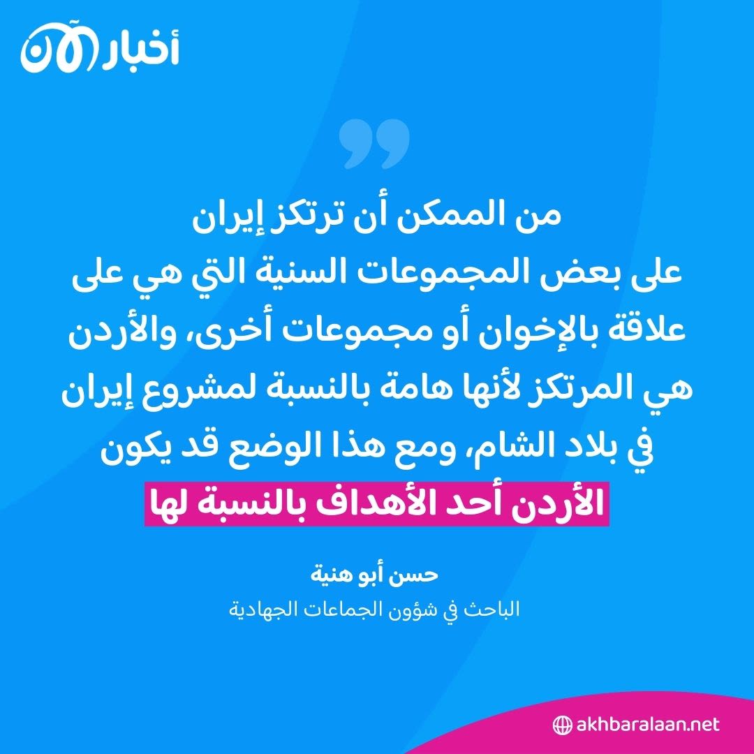 يقول عامر السبايلة - المحلل السياسي والاستراتيجي لـ أخبار الآن " بلا شك يعمل النظام الإيراني طيلة السنوات الماضية على خلق كيانات موازية بالنسبة له في عدة مناطق في الوطن العربي، ويحاول كذلك في الأردن، ومنذ بدء الأزمة السورية تحولت الحدود الجغرافية الأردنية لنقطة استهداف مباشر سواء كان ذلك في عملية المخدرات ودعمها، أو بمحاولات تهريب السلاح وإيجاد خلايا في الداخل للاعتماد عليها".