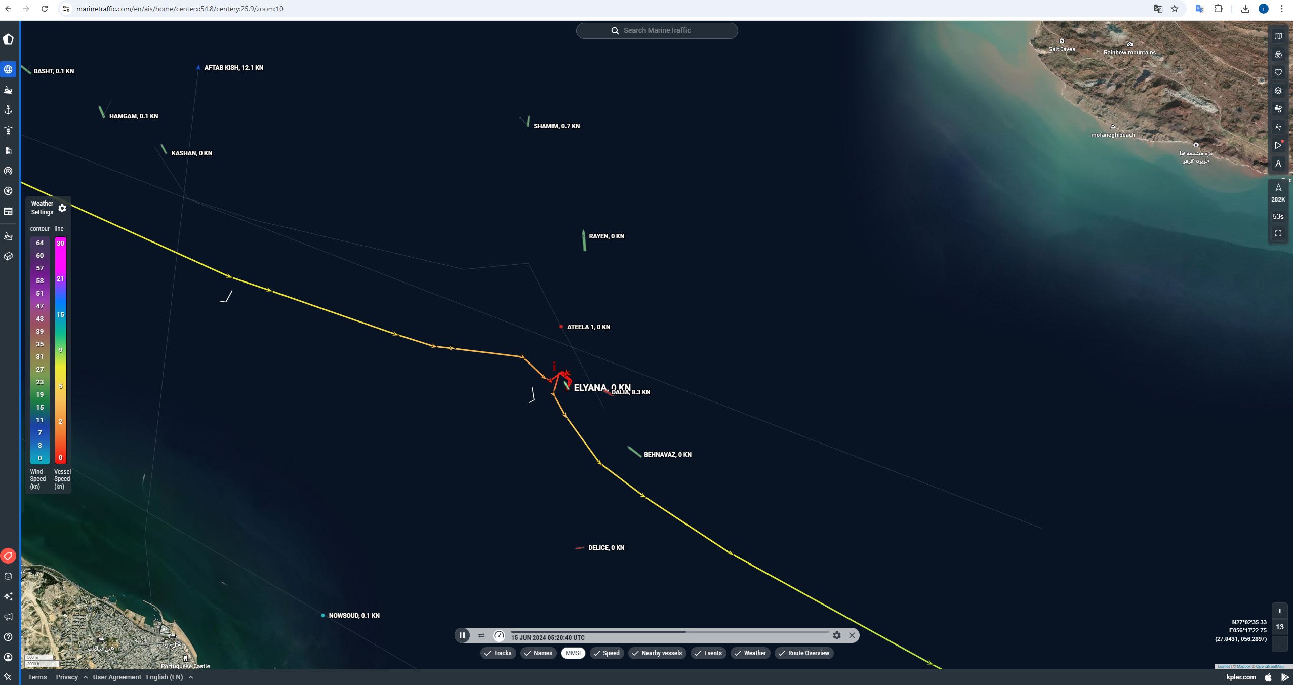 انطلقنا في رصد إليانا في منتصف يونيو الماضي اعتمادا على بيانات موقع تتبع السفن Marine Traffic. غادرت إليانا ميناء الشهيد رجائي في 14 يونيو 2024، لكن قبل خروجها من المياه الايرانية، توقفت قرب جزيرة هرمز لمدة 18 ساعة حيث كانت على مقربة من السفينة الإيرانية الأخرى BEHNAVAZ، الموجودة هي الأخرى أيضا على قائمة العقوبات الأمريكية مما يثير الشكوك حول تنسيق محتمل بين السفينتين لتبادل الشحنات.