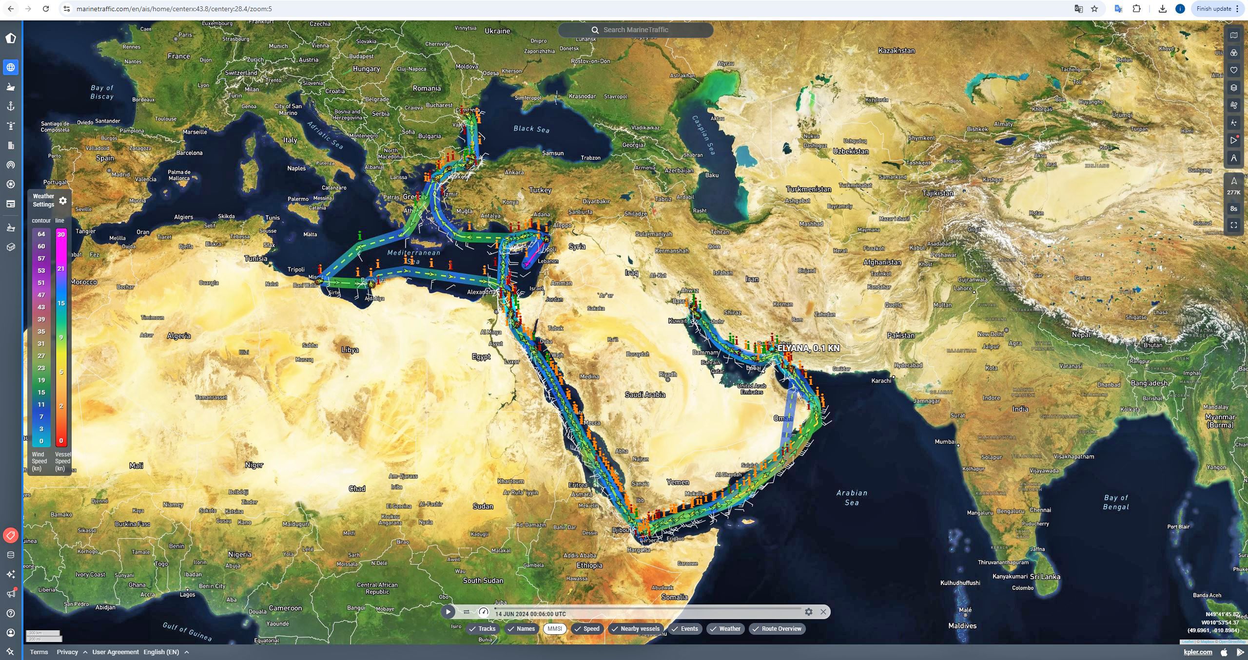 تحركات إليانا منذ 14 يونيو 2024 بناء على إشارات نظام التعرف التلقائي، المصدر مارين ترافيك.
