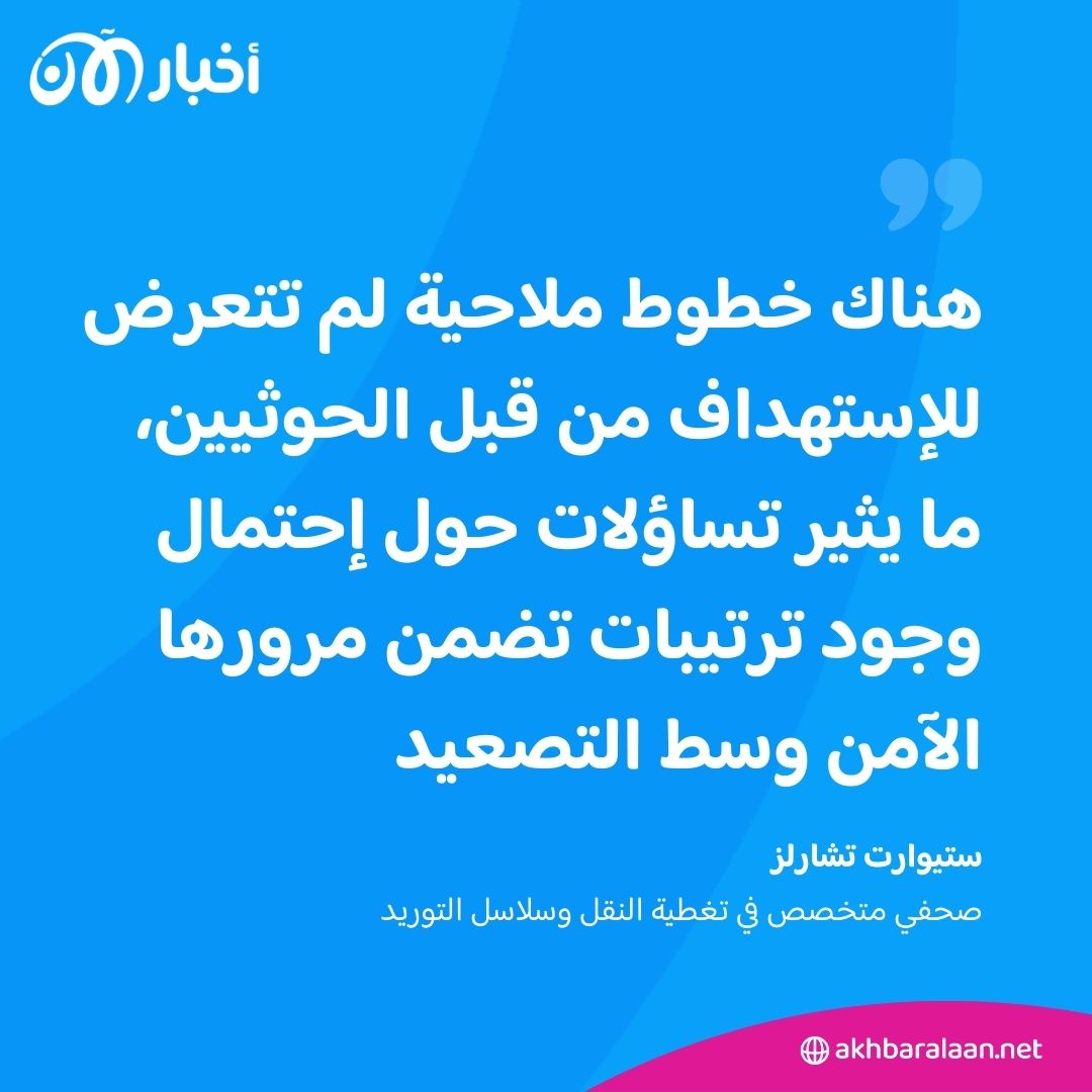 يقول ستيوارت تشيرلز- صحفي متخصص في تغطية النقل المتعدد الوسائط وسلاسل التوريد، لأخبار الآن، "رغم تصاعد الهجمات الحوثية على السفن التجارية، إلا أن شركة الشحن الفرنسية CMA CGM واصلت تسيير سفنها عبر البحر الأحمر دون تعرض أي منها لهجمات، ما يثير تساؤلات حول احتمال وجود ترتيبات مالية تضمن مرورها الآمن وسط هذا التصعيد."
